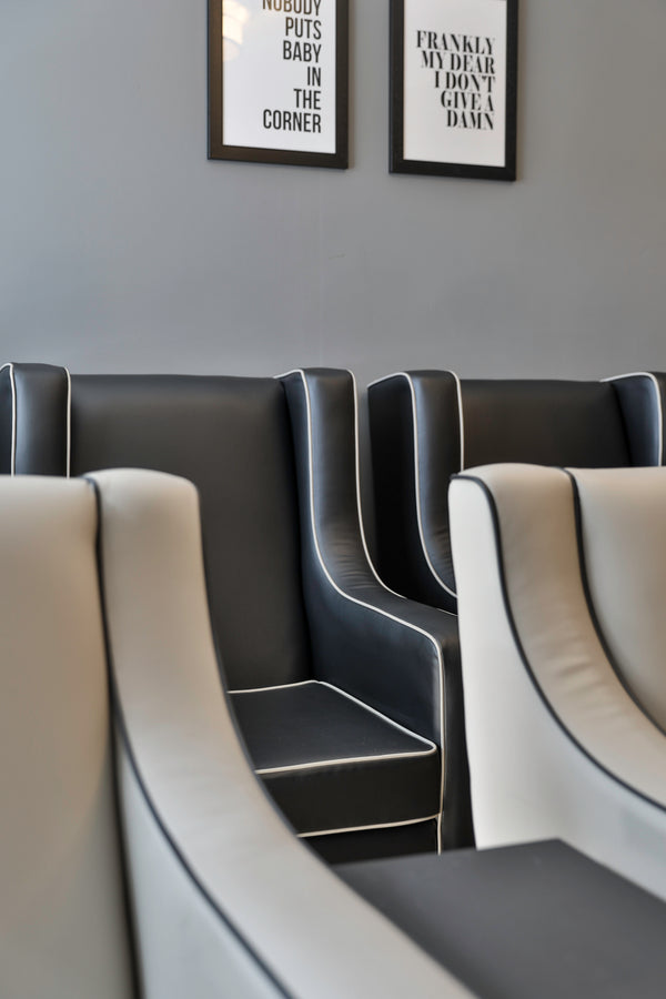 New customer lighting was factored in to ensure maximum benefit was achieved. For the seating, rather than opt for stock upholstery fabrics, bespoke faux leather was utilised extensively to provide a more tactile and organic feel. The Overton dining room cabinets featured Mountain Oak natural wood surfaces and a Mussel paint finish. Just days after the designs were submitted, they were reviewed and given an emphatic ‘thumbs up’ by Andrew Wood.